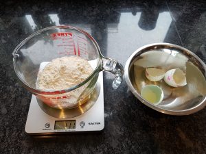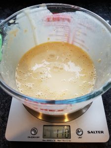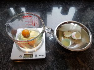 - Zero your scales with the jug on it. Crack both eggs into the jug and note the weight (approx 100g for 2 medium eggs)