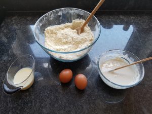 - Add the eggs, milk (of your choice) and Sourdough starter to the mix and stir together to form a sticky dough.