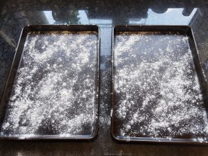- Sprinkle a nice layer of flour onto a clean! worktop. Scrape the dough from the bowl onto the flour. The dough will be quite sticky so use plenty of flour to stop it sticking to the worktop and your hands. Dust the top fo teh dough with flour then roll back of the dough towards you an press down lightly. Dust with more flour if things get sticky. Rotate the dough a quarter turn then repeat. a few more times we just want to reduce the stick nice of the outside, we are not trying to add more flour to the recipe . You should now have a lump of dough, so lift up and sprinkle more flour onto the worktop underneath it.